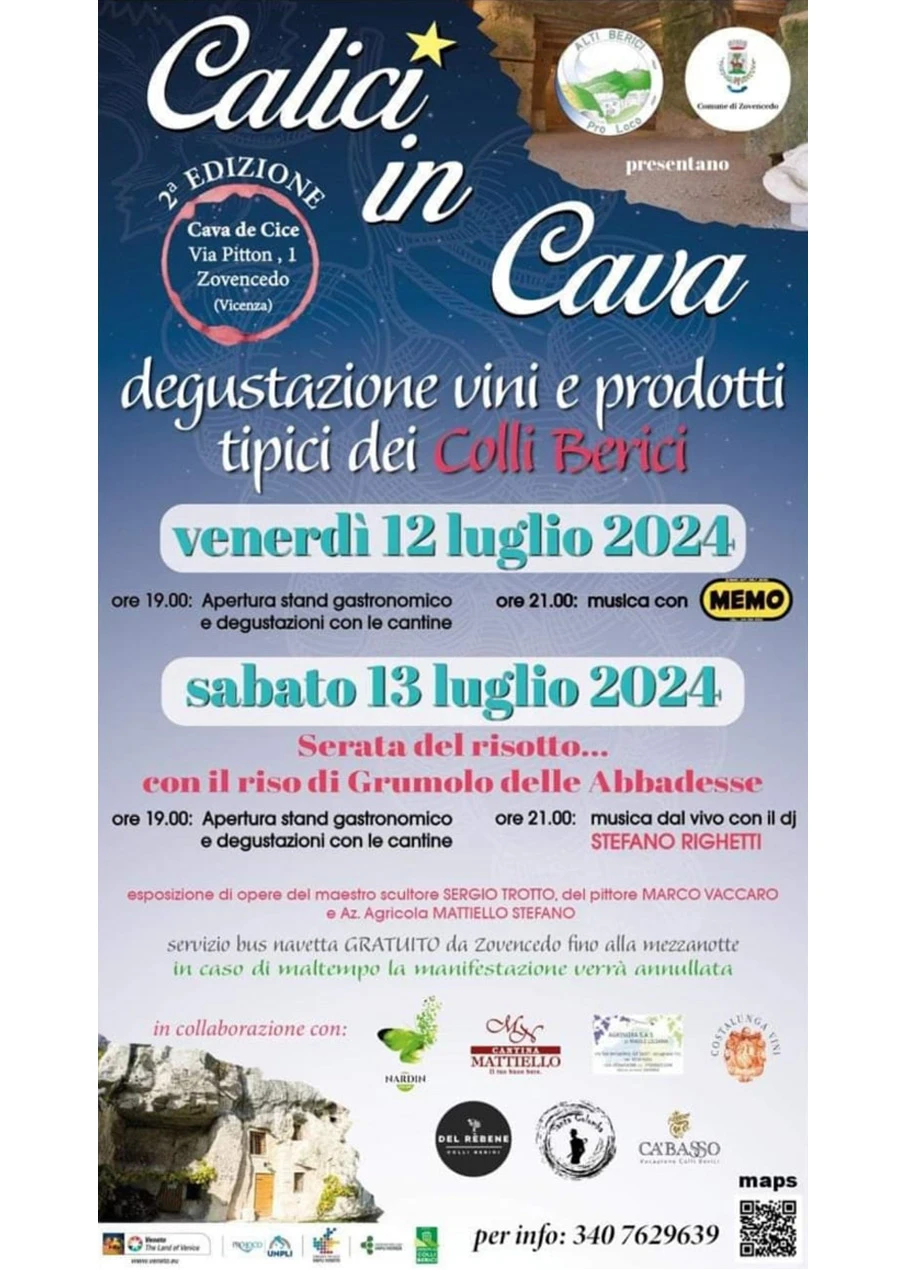 Vi aspettiamo per la seconda edizione di Calici in cava, per la degustazione di vini e prodotti ticipi dei Colli Berici. Venerdì 12 luglio e sabato 13 luglio.